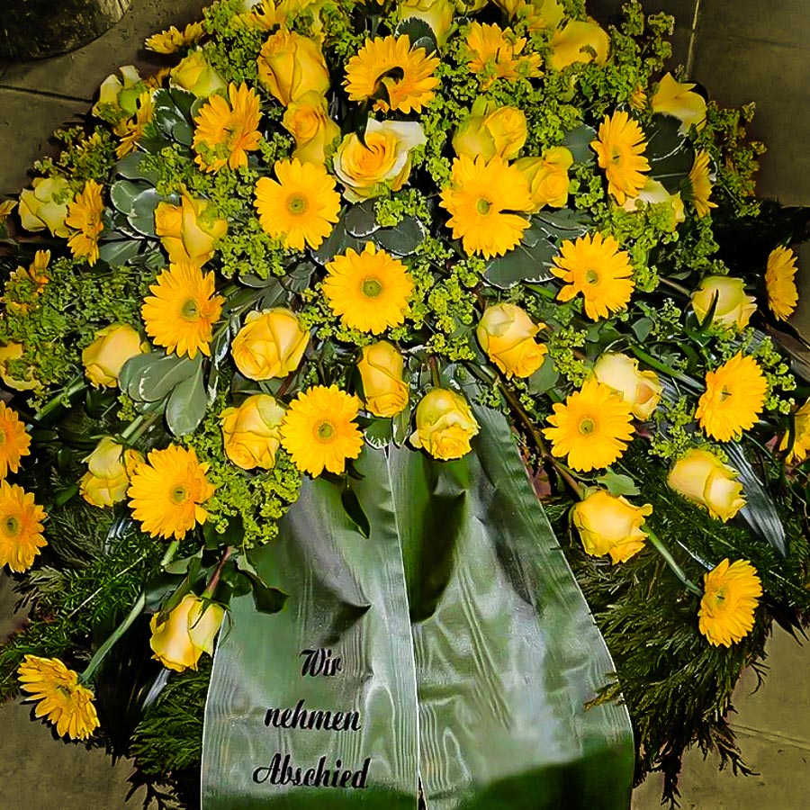 Eine bedruckte Schleife oder bemalte Blätter sind beim Arrangement bereits inklusive. Begleitendes Pflanzenbeiwerk kann entsprechend Jahreszeit oder Verfügbarkeit teilweise variieren. Bei Trauergestecken und Herzen sind mit telefonischer Beratung auch kleinere Ausführungen möglich. Liefergebühr zum Friedhof: Abhängig von Entfernung und Umfang zwischen 15,00 € und 30,00 €. Bei Friedhöfen im Duisburger Westen und Süden verzichten wir auf Liefergebühren.